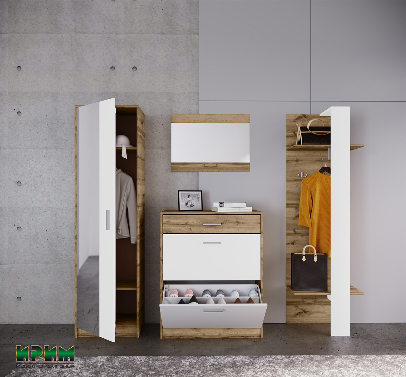 Композицията включва висок гардероб с огледало, модулен шкаф за обувки с капаци, горен шкаф за съхранение и практично пано с рафт и закачалки.