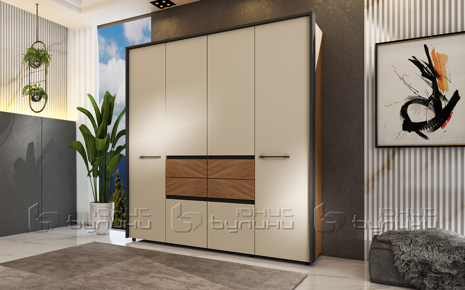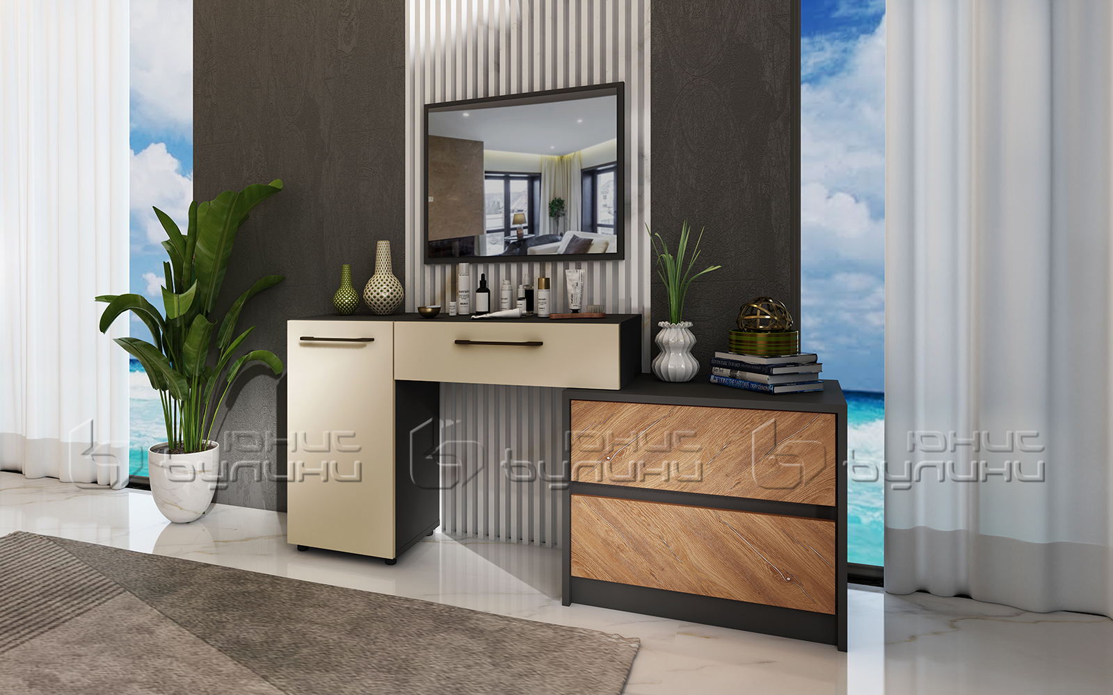 Спалният комплект мебели Дубай съчетава контрастна, подредена визия и функционални решения: гардеробвъншни чекмеджета, тапицирано легло с повдигащи амортисьори. Ако търсите готови мебели за спалня този модел покрива най-важното за ежедневния комфорт.