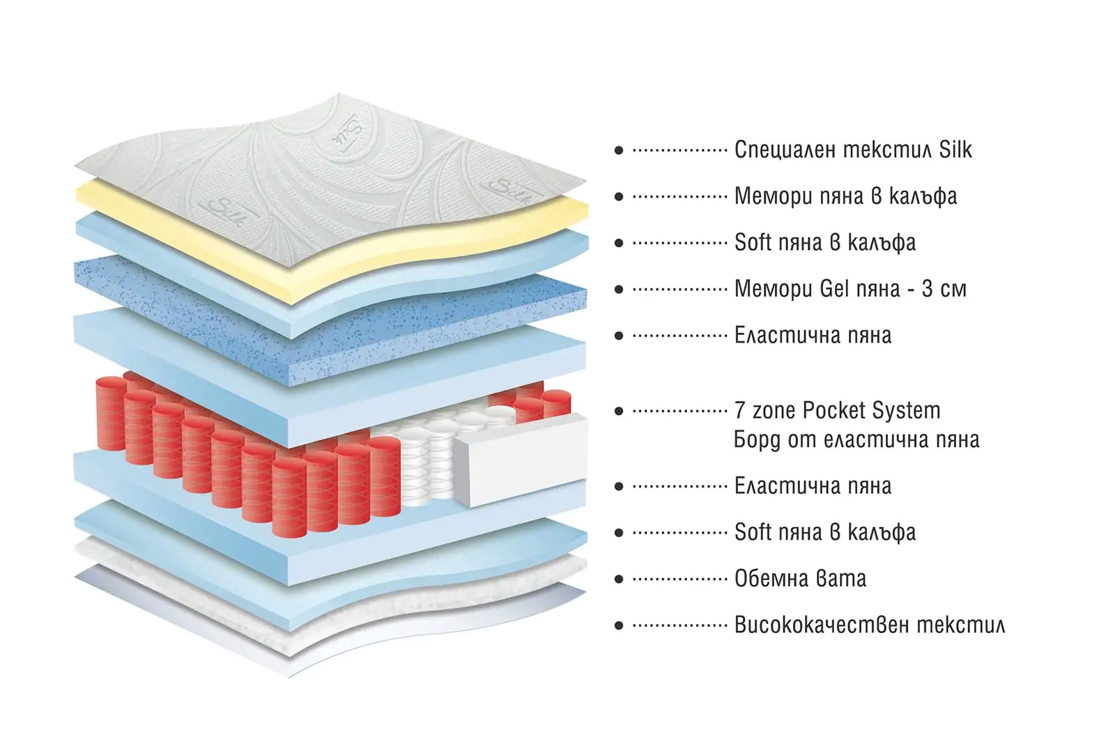 ● Матрак с прошивка - специален текстил Silk, Memory пяна/обемна вата, soft пяна.
