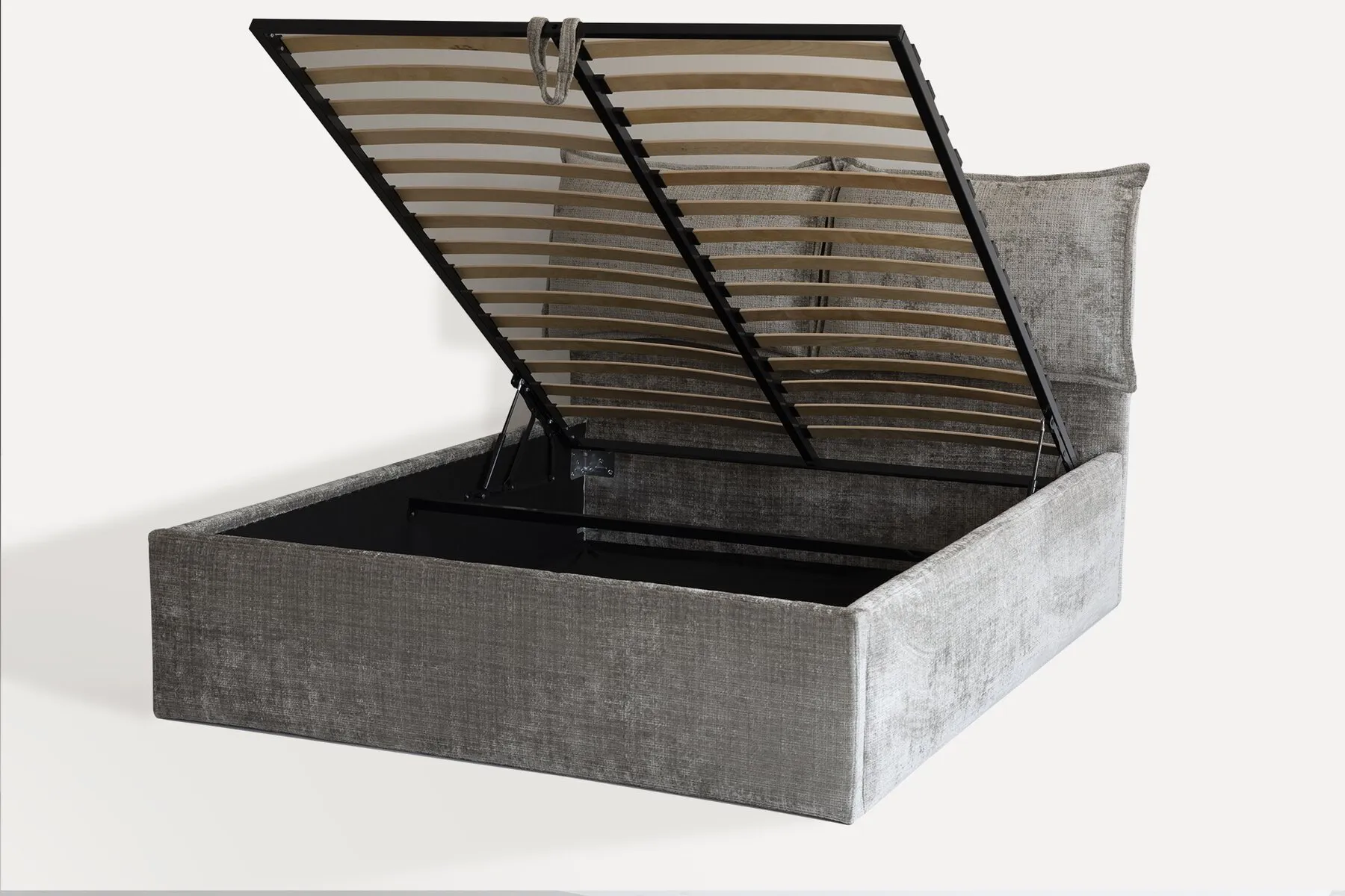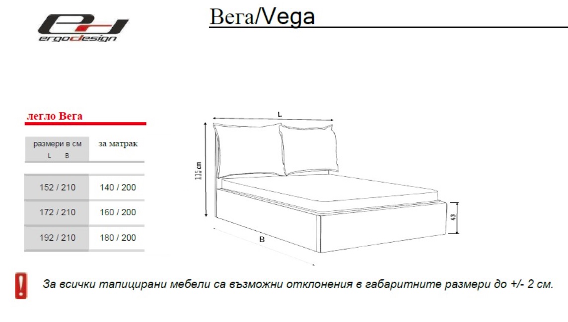 Тапицирано легло Вега може да бъде поръчано както с матрак, така и без матрак, според личните предпочитания. В цената са включени метална подматрачна ламелна рамка и комплект механизми за повдигане на матрака, които разкриват удобно пространство за съхранение.