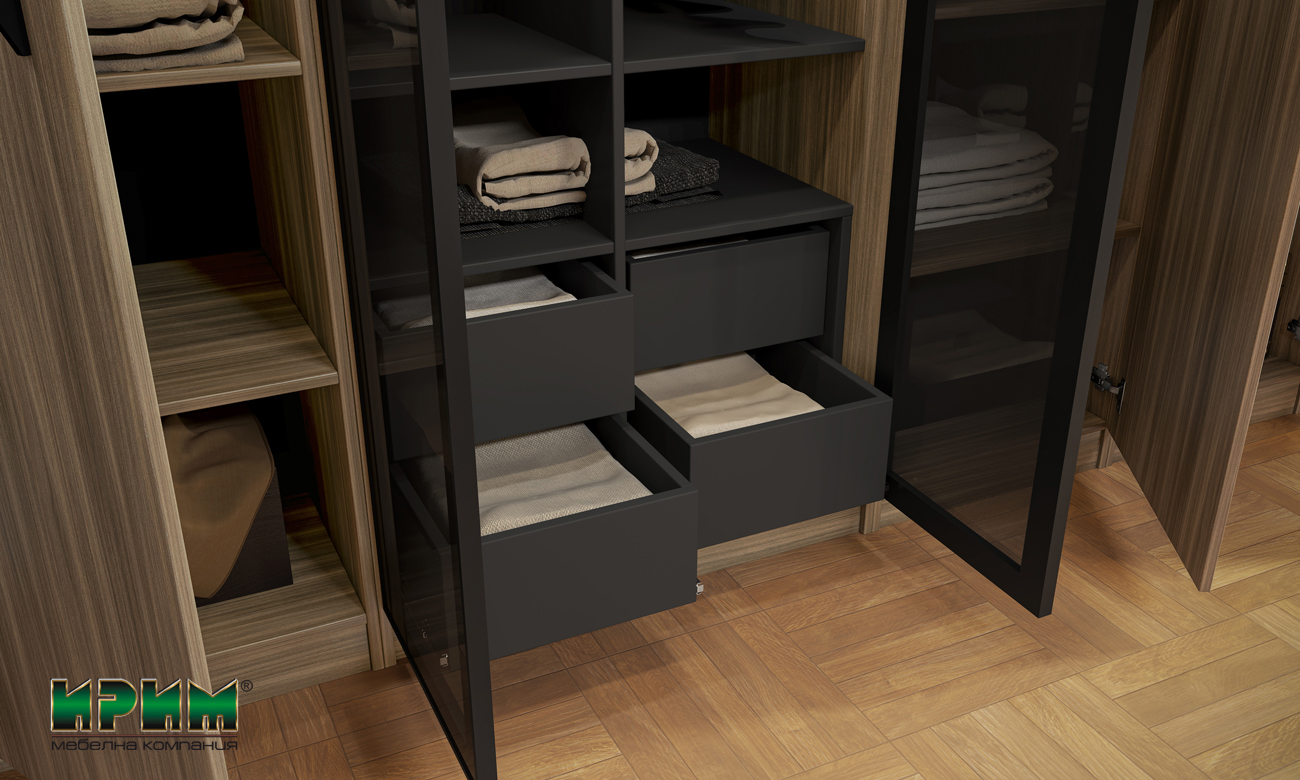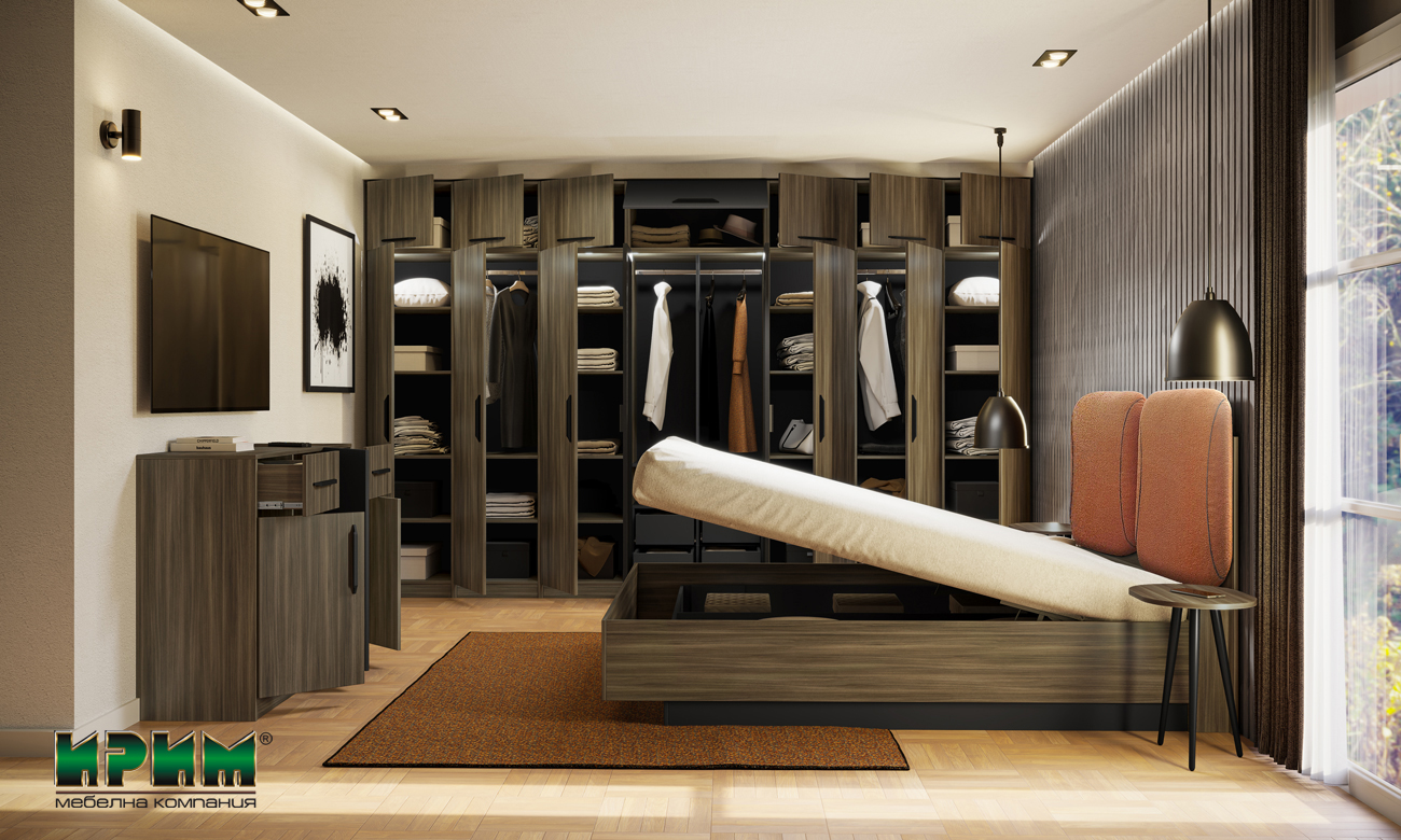 Може да поръчате допълнително гардеробна конфигурация с множество отворени и затворени модули – впечатляващо решение, което осигурява не само място за съхранение, но и визуален ред.