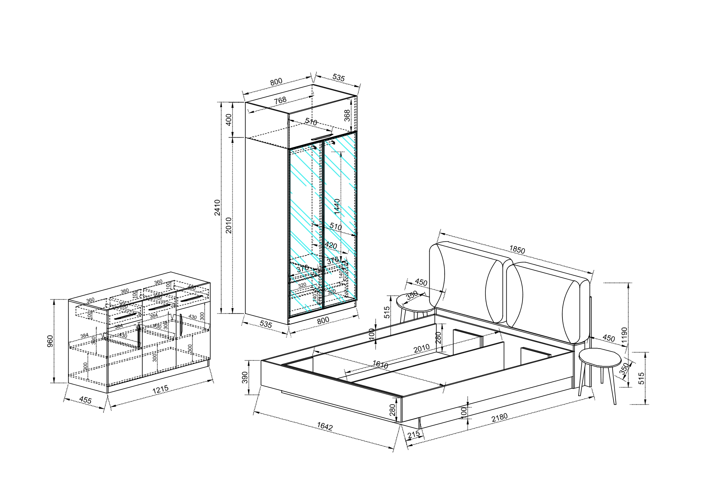 Размери спален комплект модулни мебели 7091. Посочената цена включва:
