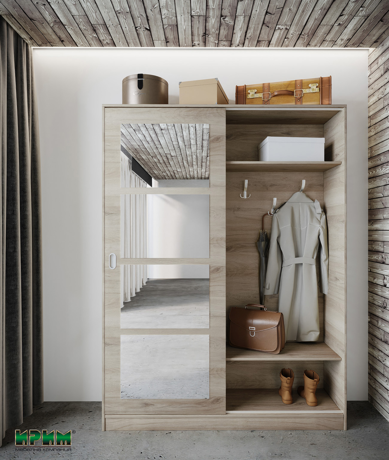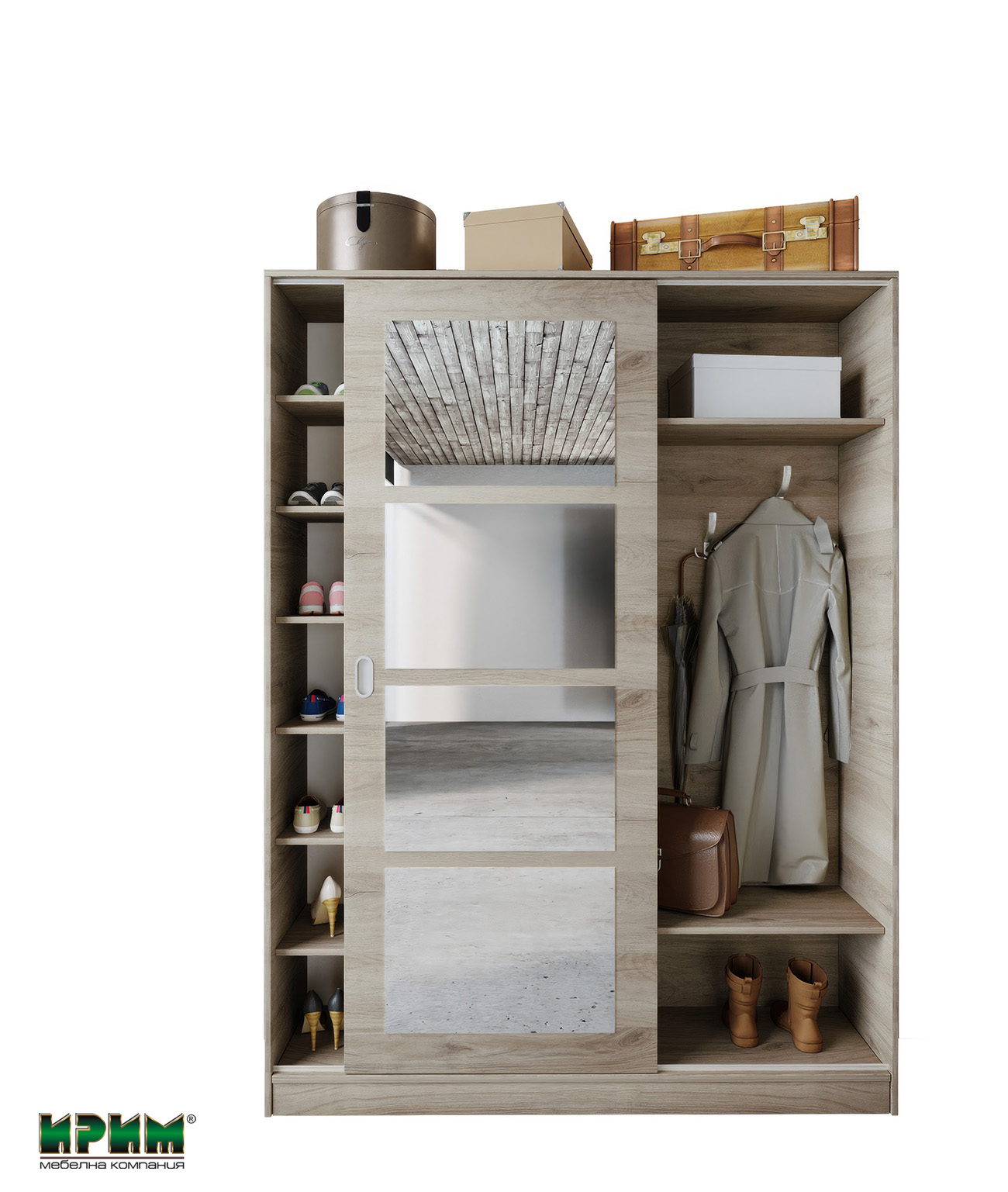 ● Портманто с плъзгаща врата с огледало, сектор с рафтове и закачалки.