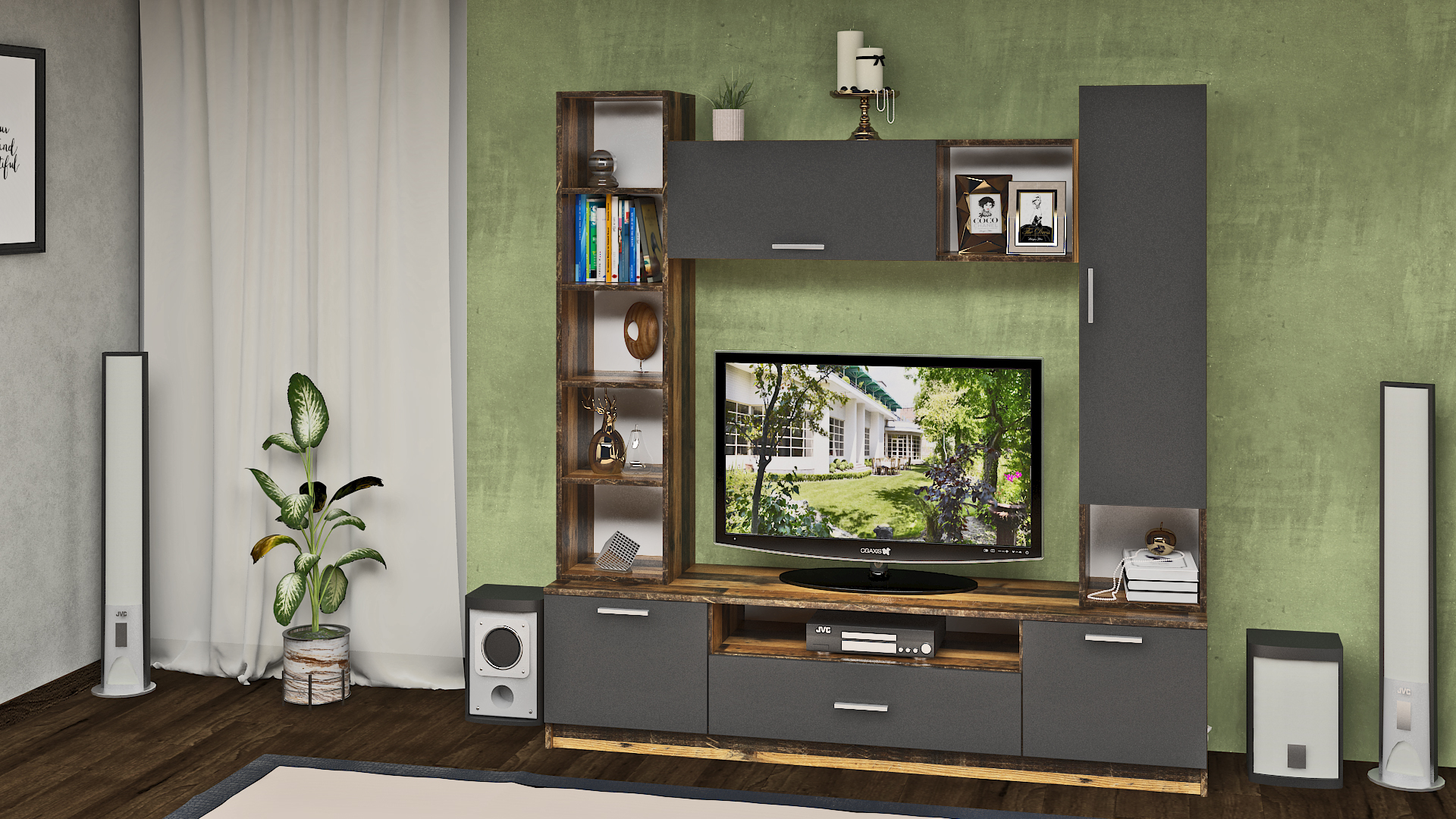 Тази модерна секция съчетава класическа функционалност и модерна естетика. Отворените етажерки позволяват да изложите любими книги и сувенири, докато затворените шкафове осигуряват достатъчно пространство за съхранение. ТВ модулът е подходящ за различни размери телевизори и техника, а изчистената геометрия на дизайна създава подреденост и визуален комфорт.