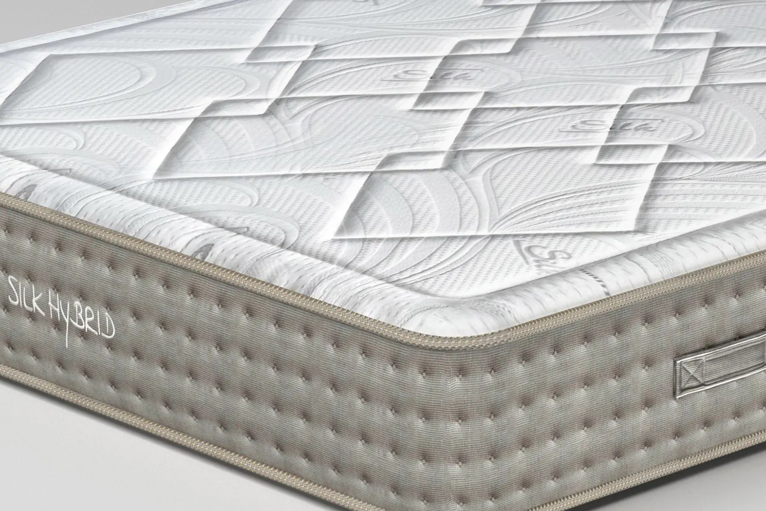 Матракът е с изчистен, класически силует, а нежно сивият борд и фина прошивка по страните придават модерен, но уютен вид. Логото „SILK HYBRID“ е бродирано с изискан минимализъм, като обещание за елегантен комфорт и дълбок сън.