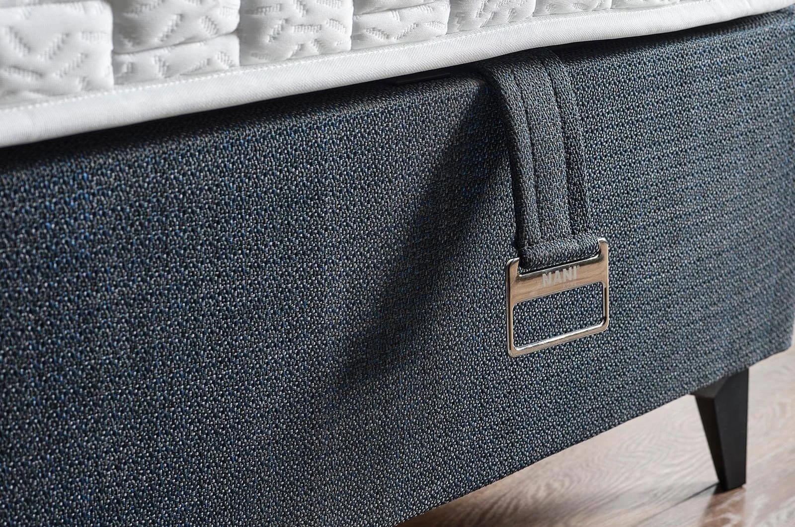 ✔ Основата на леглото е облечена изцяло в същия мек текстил и оформя компактно, хармонично тяло. Линиите са прави и чисти, а дискретните дръжки добавят практична нотка, която не нарушава дизайна.
