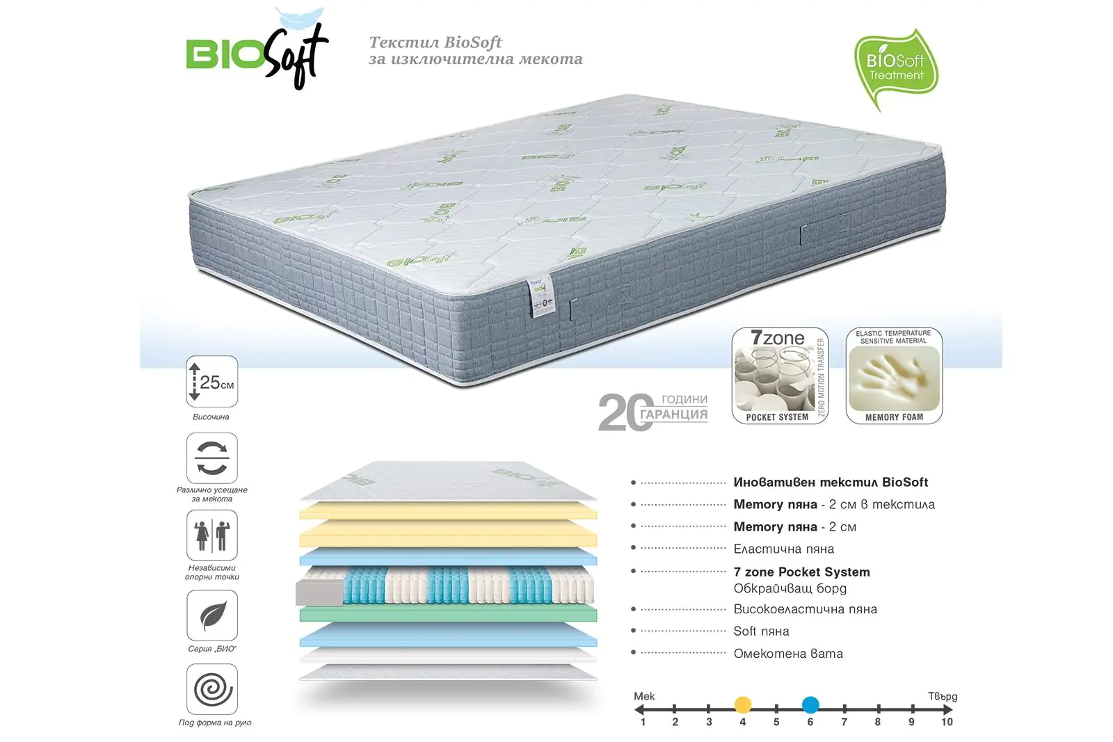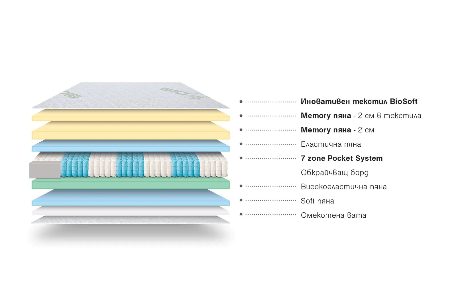 BioSoft е съвременен двулицев матрак от серия BIO, който съчетава 7-зонова Pocket System, мемори пяна, високоеластична и Soft пяна и иновативен текстил. Две страни с различно усещане, дълготрайна опора и впечатляващ комфорт – това e възстановяващ сън.