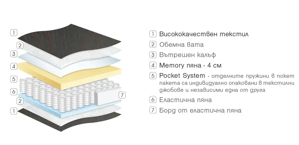 Admiral съчетава независими Pocket пружини, мемори пяна, еластична пяна и висококачествен текстил в стилен, модерен пакет. Това е матрак с мемори пяна и еластична опора, който предлага две лица на комфорта, дълготрайна стабилност и впечатляващ дизайн.