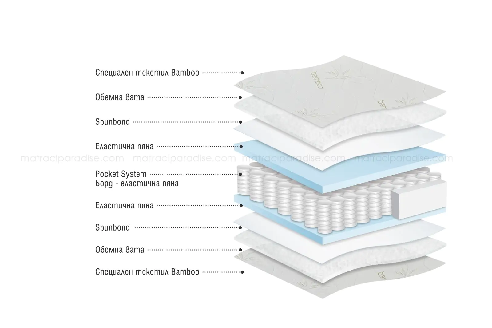 Bamboo Pocket съчетава независими пружини Pocket System, надеждна еластична пяна и сваляем бамбуков калъф в един модерен двулицев матрак. Това е практично, свежо и удобно решение за хора, които ценят добрата опора, естествените материи и лесната поддръжка