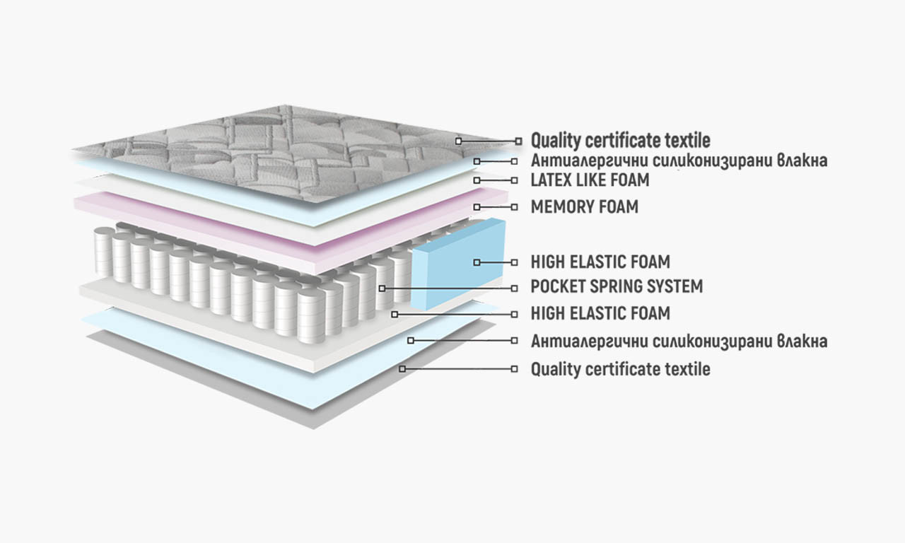 Състои се от покет пружини, мемори пяна, високоеластична пяна и латексоподобна пяна.