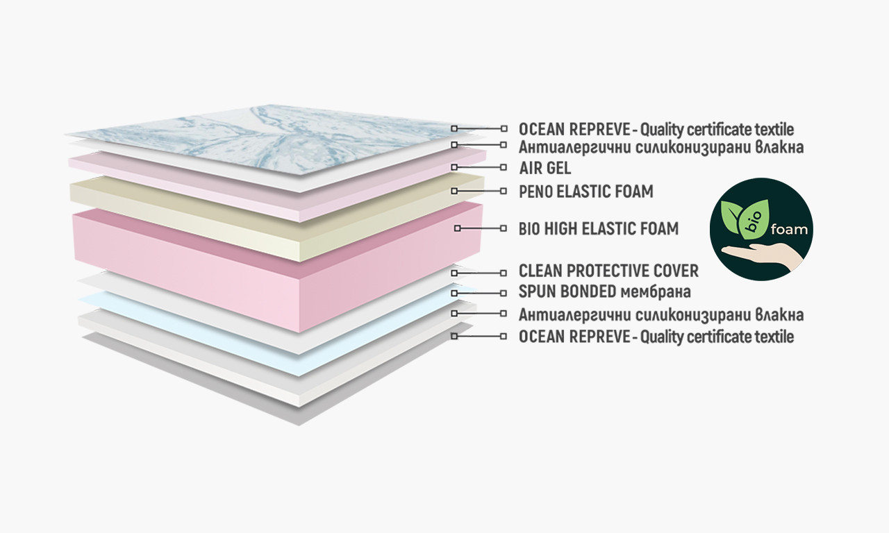 AIR GEL диша, гали, поддържа и същевременно намалява и облекчава налягането в точките на допир с тялото. По– високата постоянна еластичност улеснява движенията по време на сън. Притежава хигиенна устойчивост.