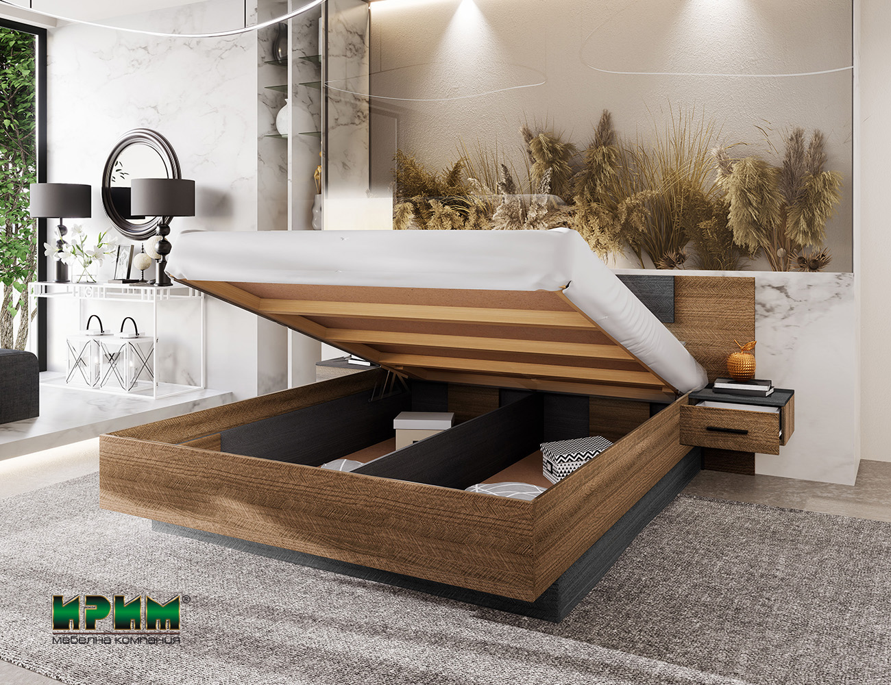 ✔ Спално легло с повдигащ механизъм и газови амортисьори, предлагащо голямо място за съхранение – идеално за завивки, спално бельо или сезонни вещи.