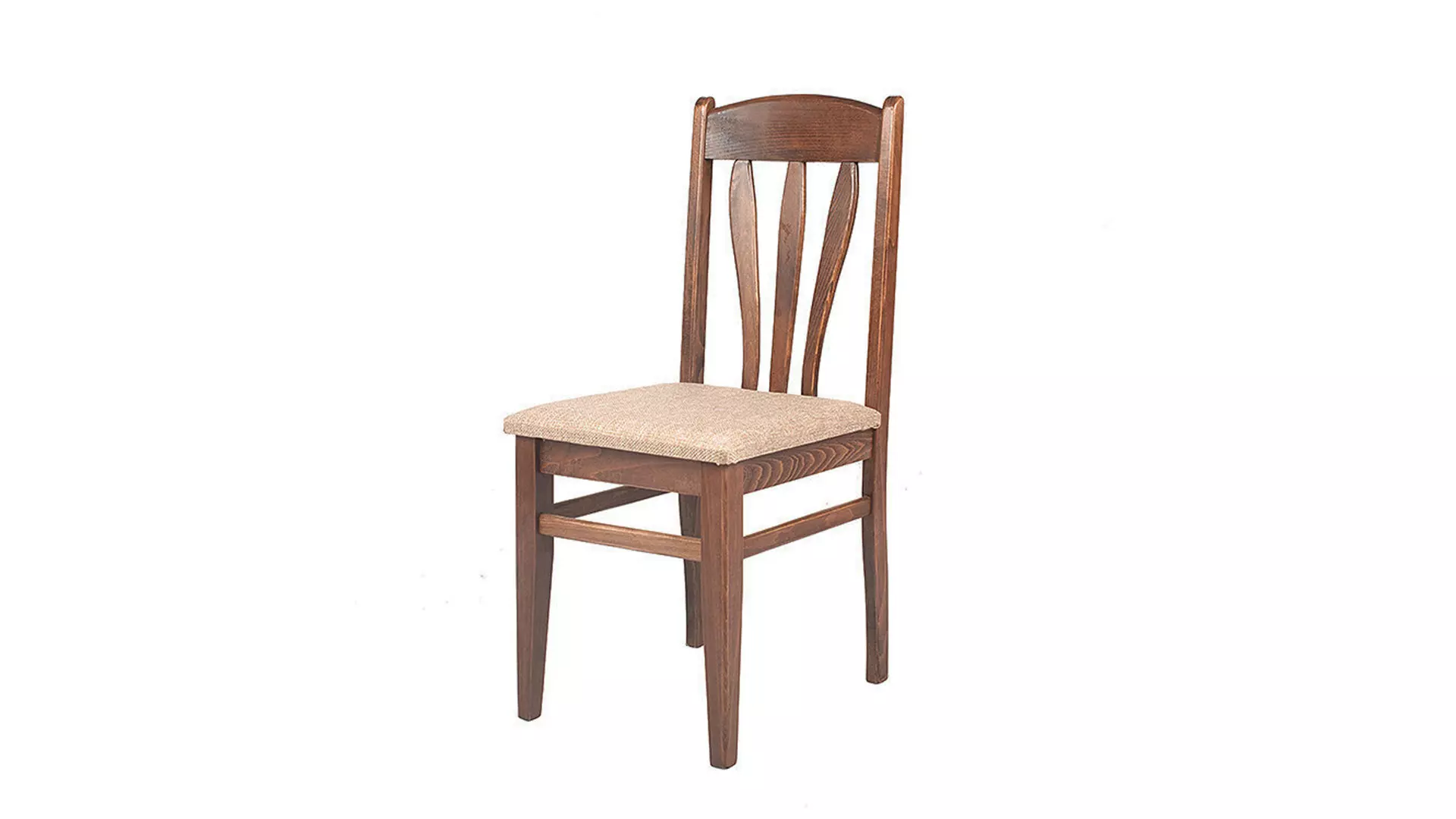 Седалката е тапицирана с текстурирана дамаска в естествен тон, която допълва топлия дървесен цвят и придава завършен вид на този модел трапезен стол. Дизайнът е едновременно класически и непретенциозен – стил, който се адаптира към всяка обстановка, независимо дали е модерна кухня или традиционна трапезария.