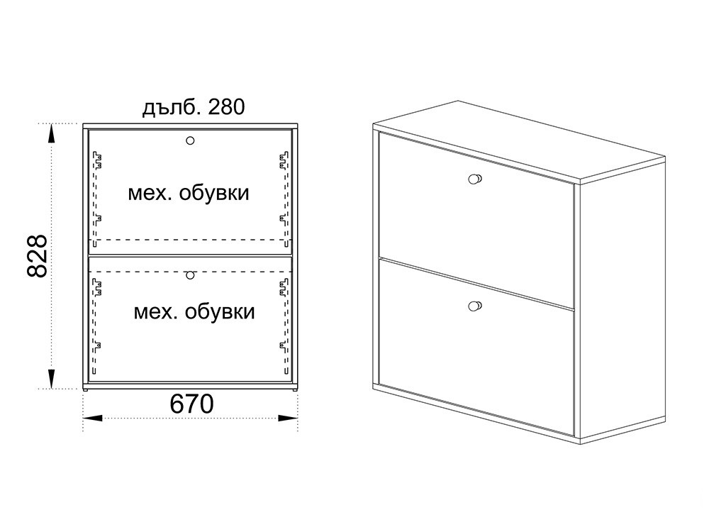 ● Шкаф за обувки с два чекмеджета с двуредов механизъм за два реда обувки.